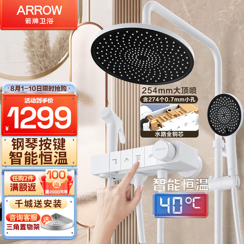 箭牌(ARROW) 淋浴花洒套装增压花洒全套莲蓬头淋雨器套装浴室花洒按键花洒 【钢琴白】按键丨恒温款价格:1549.00元!