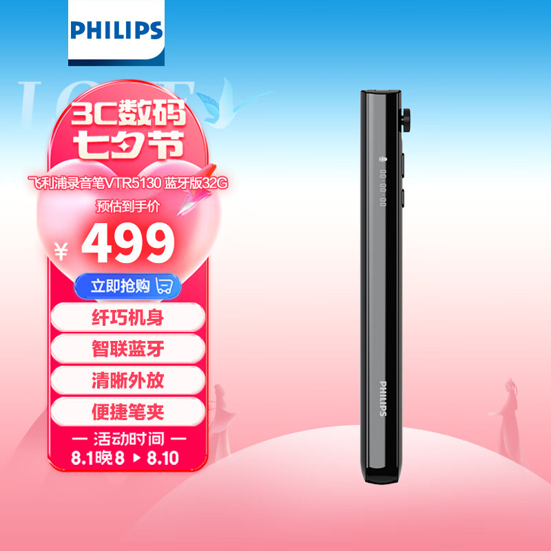 飞利浦(PHILIPS)胸牌录音笔VTR5130 商务会议隐藏专业语音转文字高清降噪便携小巧取证一键录音设备32G蓝牙版价格:549.00元!