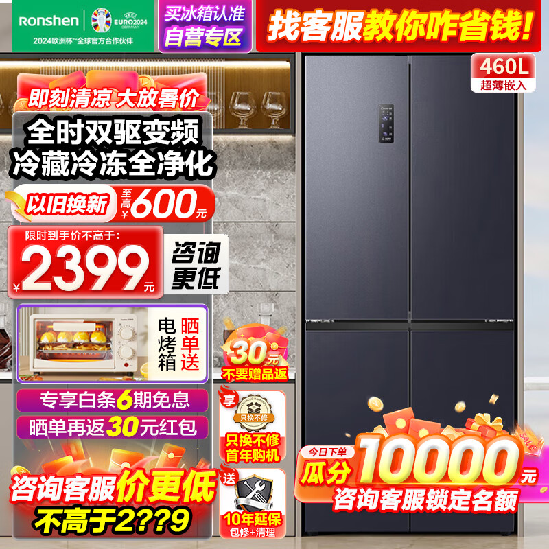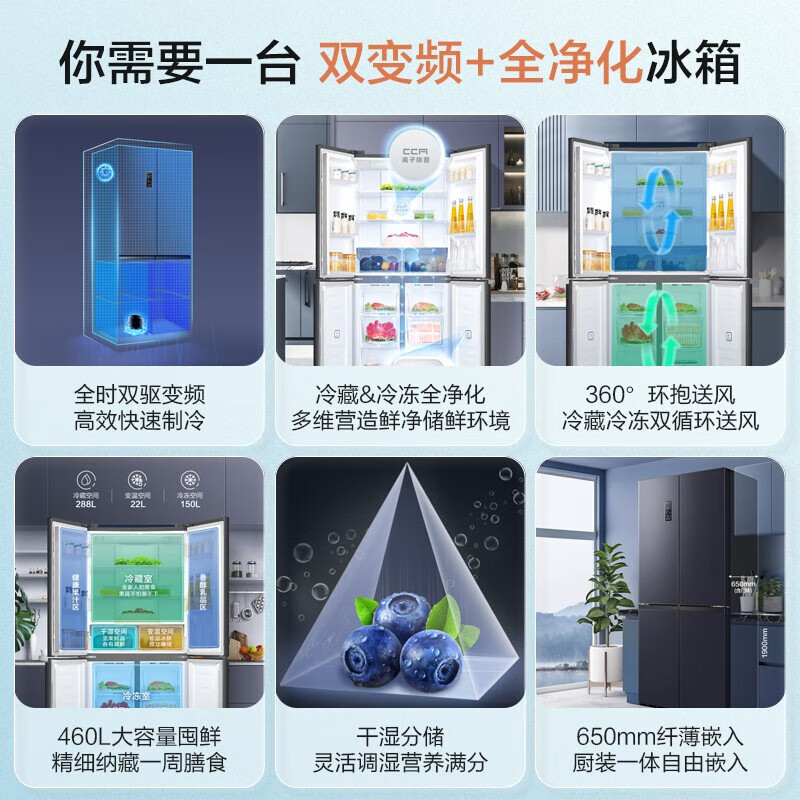 容声【全空间净化升级】460升十字对开门一级能效风冷无霜大容量超薄嵌入式四开门家用电冰箱价格:2449.00元!