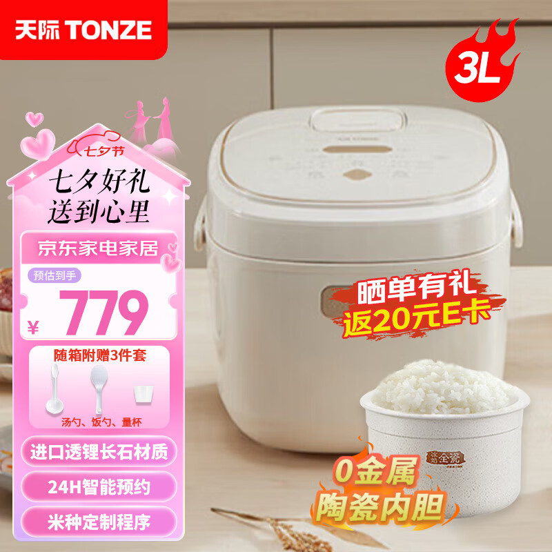 天际(TONZE)电饭煲3L 家用陶瓷内胆不粘电饭锅 大容量智能预约0涂层饭煲多功能2-6人煮粥蒸米饭锅 BYQC22C30GC价格:779.00元!