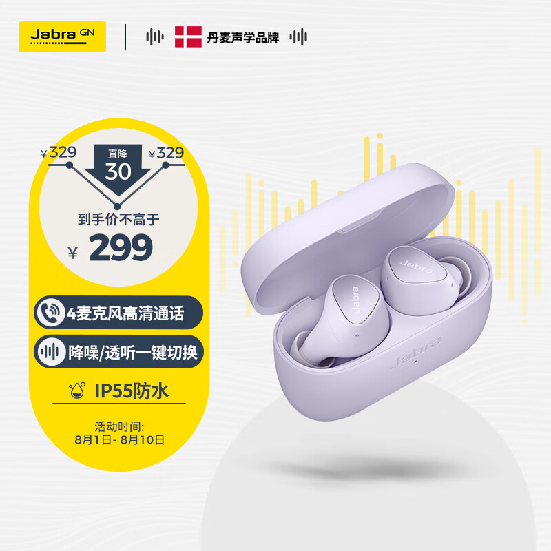 捷波朗(Jabra)Elite3 真无线蓝牙降噪耳机 蓝牙5.2 强劲续航(65t升级版E3) 安卓苹果音乐耳机 烟灰紫色价格:329.00元!