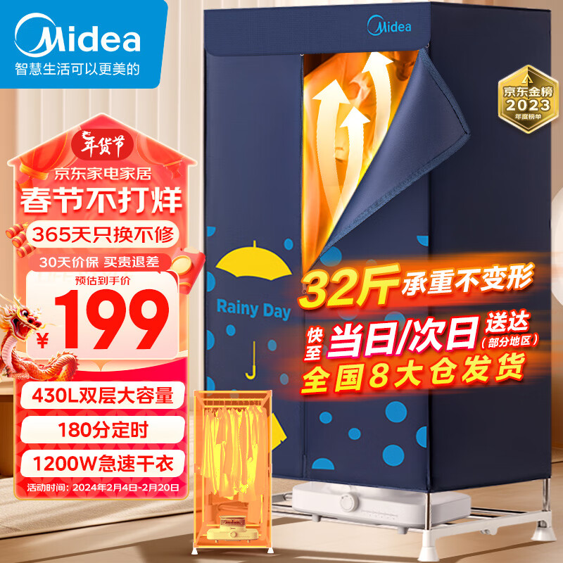 美的(Midea)【430L容量双层】干衣机烘干机家用婴儿衣物暖风烘衣机风干机32斤大承重 可定时烘干衣柜HBGJ12A2价格:240.00元!