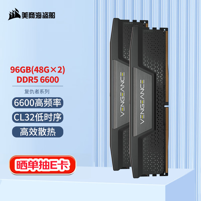 美商海盗船 (USCORSAIR) 96GB(48Gx2)套装 DDR5 6600 台式机内存条 复仇者系列 游戏条 黑色 C32价格:3199.00元!