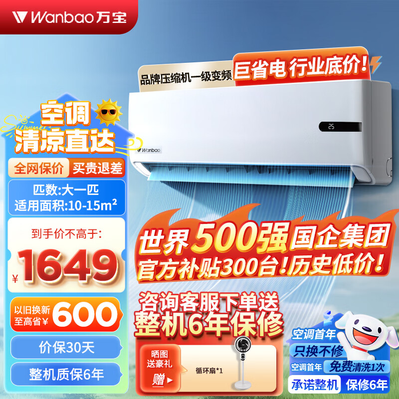 万宝空调挂机大1匹出租房 一级变频省电家用壁挂式空调 大1匹 一级能效 10-15㎡价格:2099.00元!