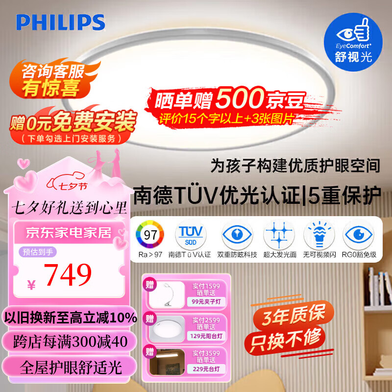 飞利浦(PHILIPS)led全光谱护眼吸顶灯卧室灯书房儿童房防眩防蓝光灯饰22W EyeCare价格:829.00元!