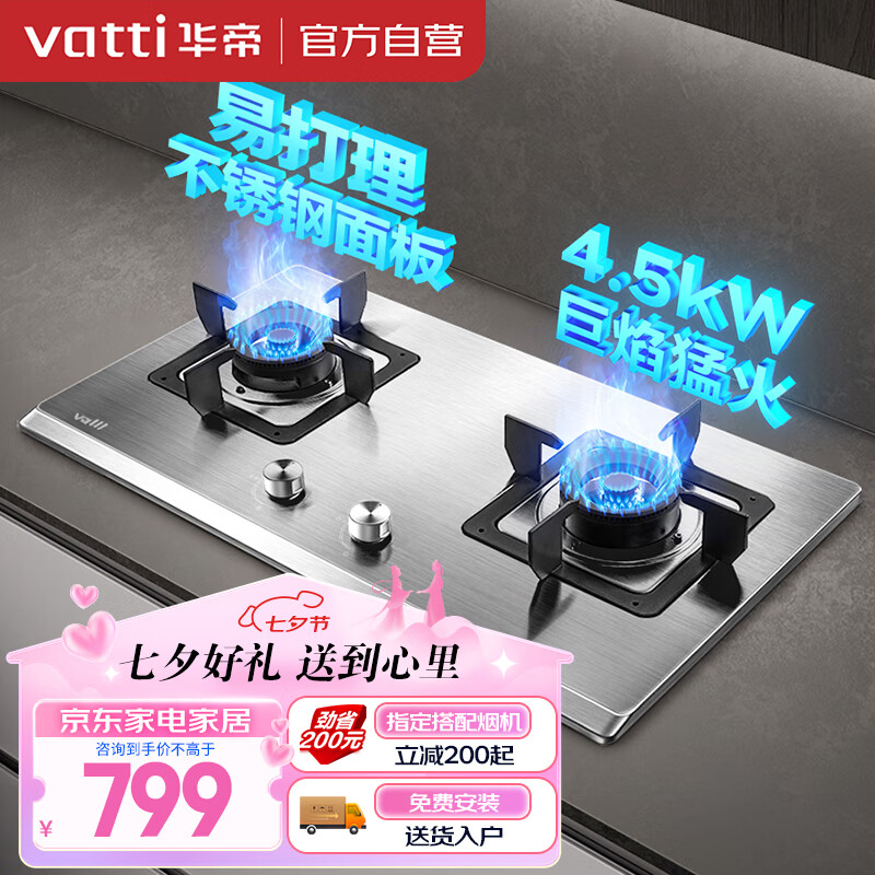 华帝(VATTI)燃气灶家用台式嵌入式两用不锈钢面板4.5kW高热效易打理煤气灶双灶台灶具 JZY-i10063A (液化气)价格:799.00元!