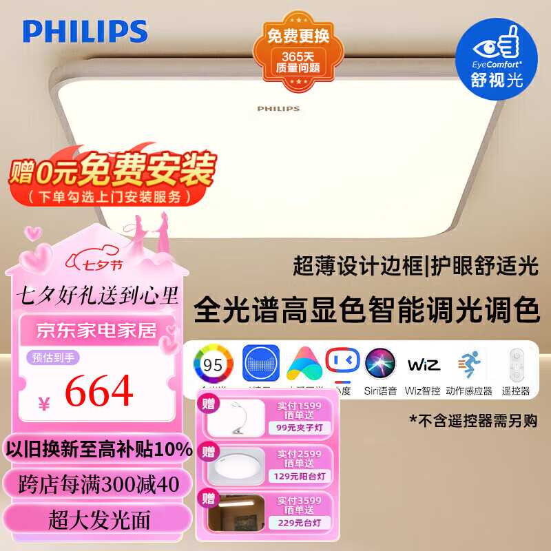 飞利浦(PHILIPS)全光谱LED吸顶灯护眼客厅灯卧室灯wiz怡轩星光银 9290040698 55W价格:744.00元!
