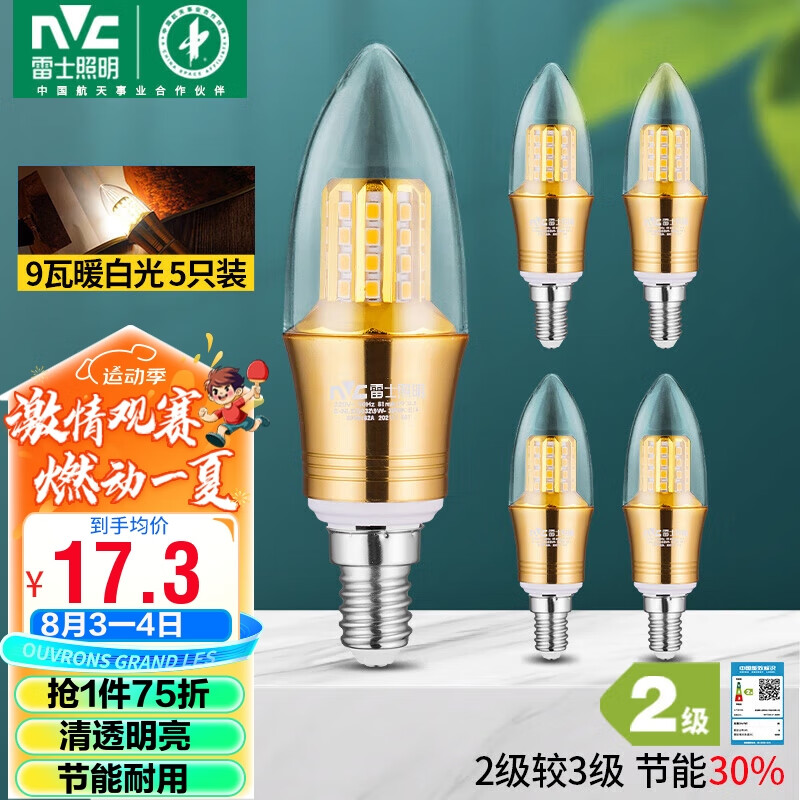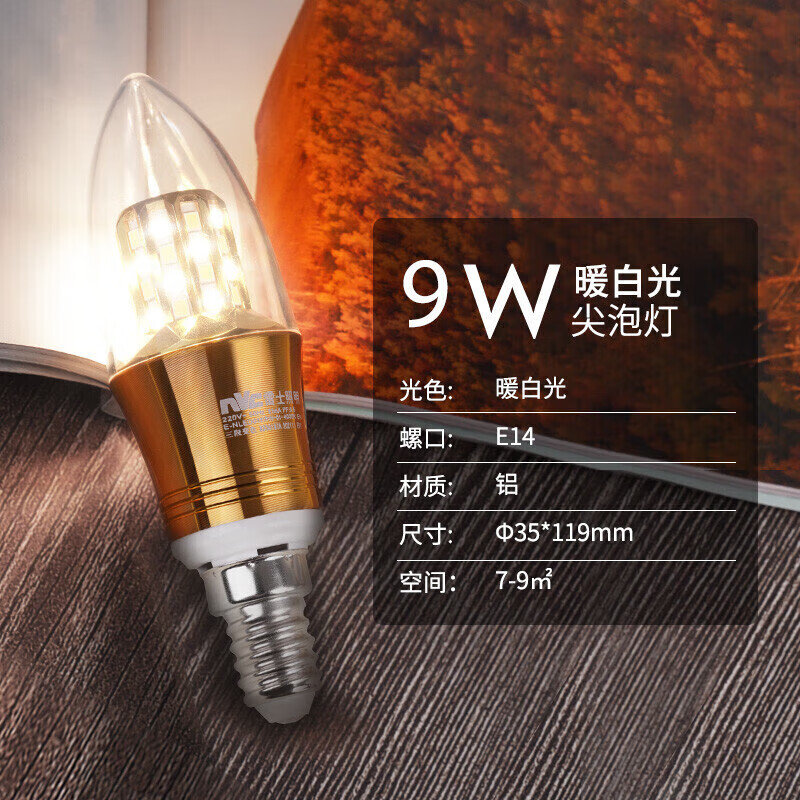 雷士(NVC)LED灯泡尖泡9瓦E14小螺口光源节能灯暖白光4000K金色5只装价格:108.00元!