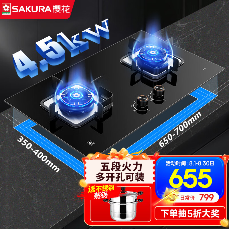 樱花(SAKURA)燃气灶天然气4.5KW大火力煤气灶双灶液化气灶台嵌入式台式两用家用炉灶具全铜火盖宽边底盘 JGA05【液化气4.5KW高效直火防爆】价格:699.00元!