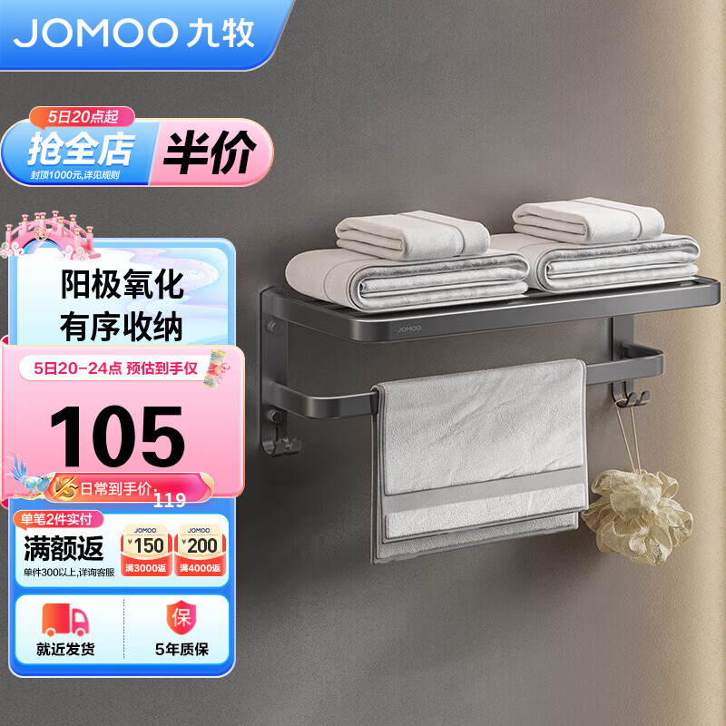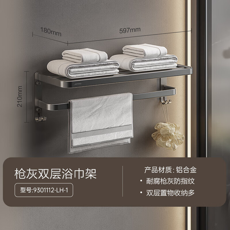 九牧(JOMOO)枪灰太空铝浴巾架卫生间浴室置物毛巾架挂件 9301112-LH-1价格:105.00元!