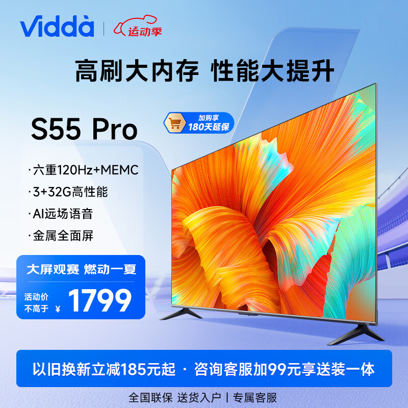 Vidda S55 Pro 海信电视 55英寸 120Hz高刷 3+32G MEMC防抖 家用智能游戏液晶巨幕大屏以旧换新55V1K-S价格:1799.00元!
