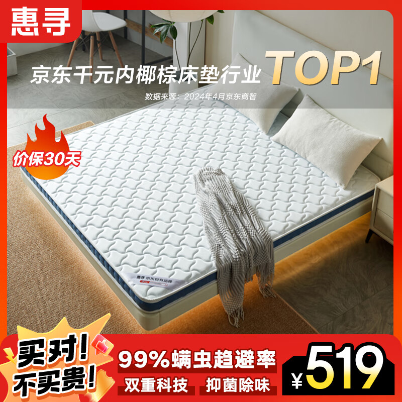 惠寻 京东自有品牌 椰棕床垫99%抑菌防螨硬垫薄床垫1.8*2米11cm厚价格:619.00元!