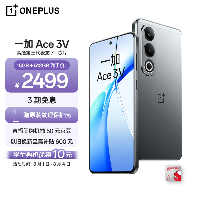一加 Ace 3V 16GB+512GB 钛空灰 高通第三代骁龙 7+ 芯片 超长续航 OPPO AI 5G直屏游戏拍照智能手机价格:2499.00元!