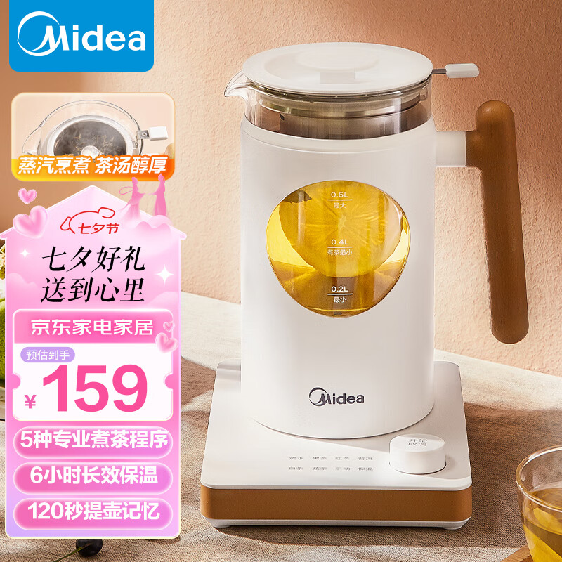美的(Midea)养生壶 煮茶壶净醇煮茶器 智能蒸汽喷淋式 蒸茶器 烧水壶提壶记忆煮茶壶茶具YS06P501价格:159.00元!