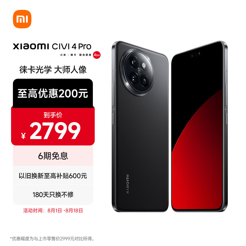 小米Civi 4 Pro 第三代骁龙8s 5000万徕卡专业人像镜头 12GB+256GB 星空黑 5G拍照AI手机 小米澎湃OS价格:2799.00元!