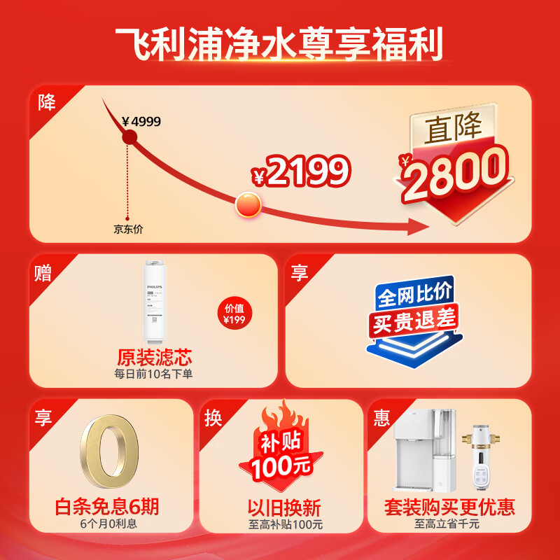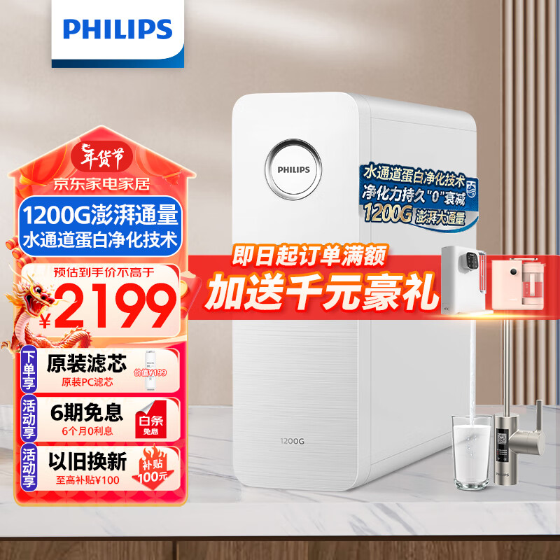 飞利浦(PHILIPS)净水器家用净水机引擎1200G 5年长效RO反渗透 3.1L/分大流速 母婴直饮 智能双出水净水器AUT7010价格:2199.00元!