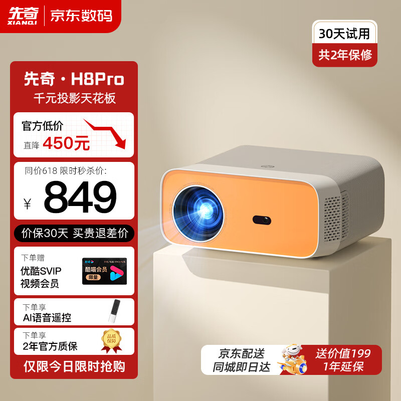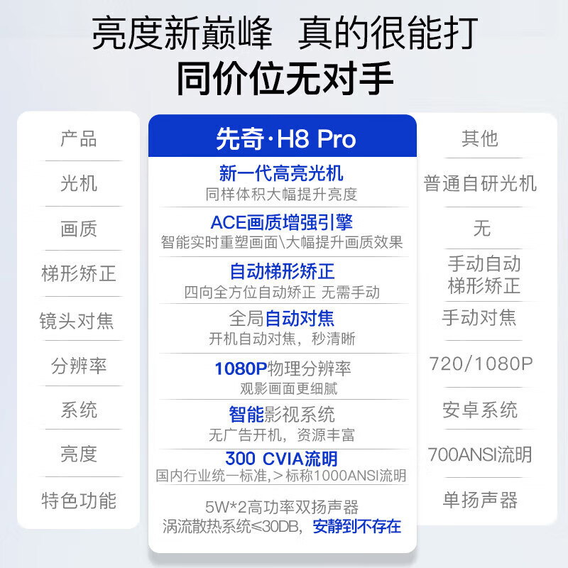 先奇(XIANQI)H8Pro 投影仪 家用投影机 智能家庭影院 (高亮升级 自动对焦 自动梯形矫正 1080P分辨率)价格:1299.00元!