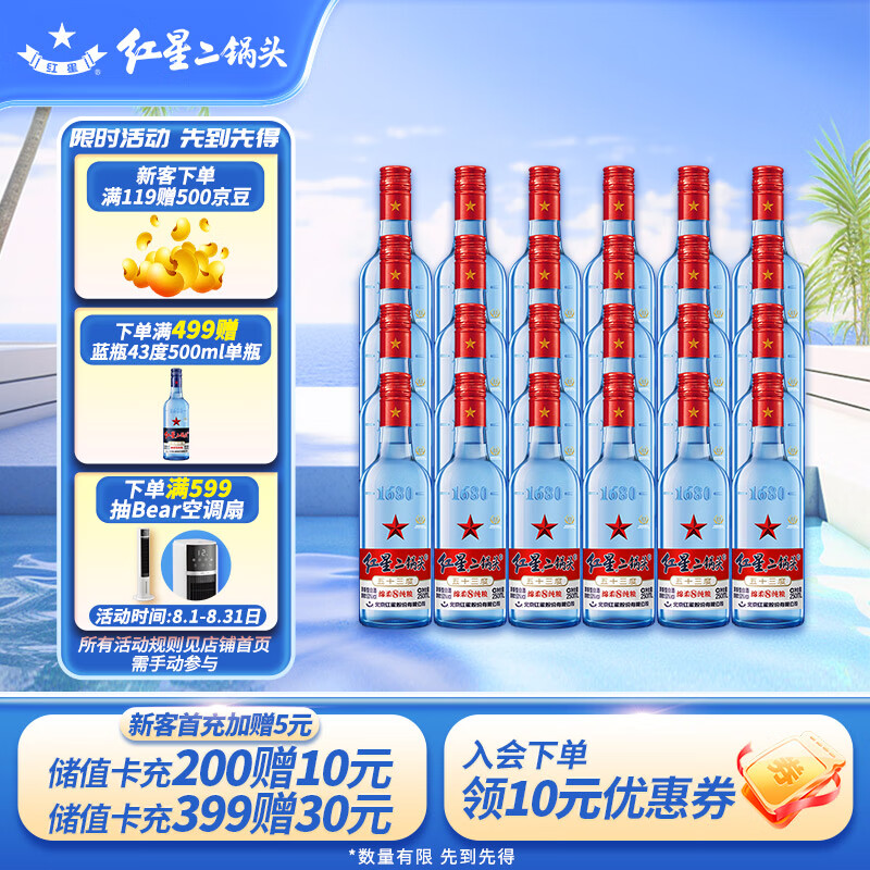 红星二锅头蓝瓶绵柔8陈酿 清香型白酒 53度 250ml*24瓶 整箱装 口粮酒价格:479.00元!