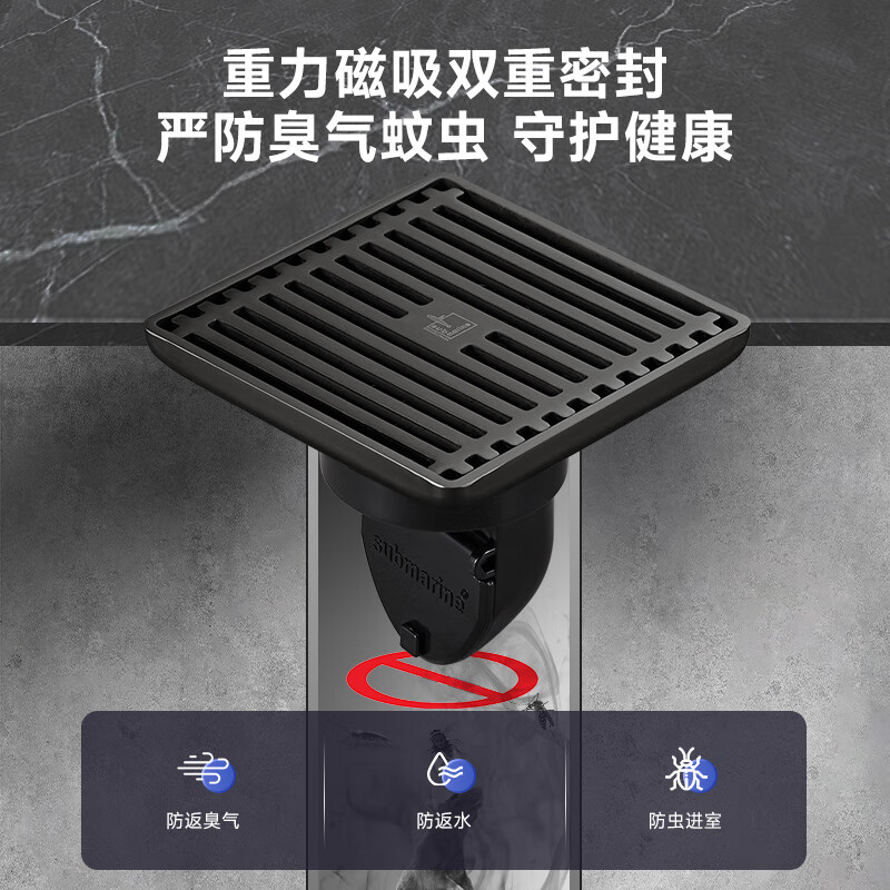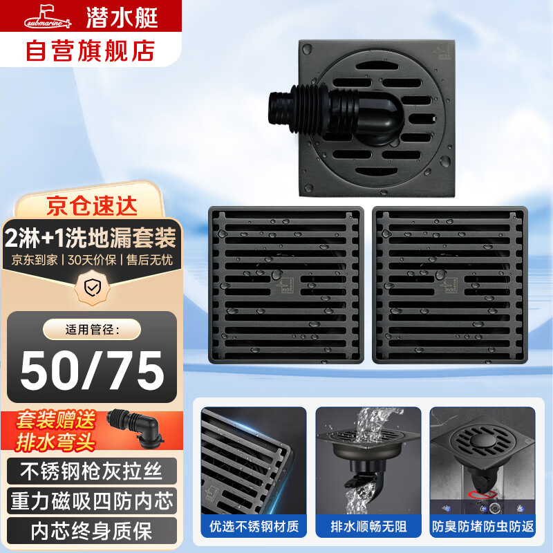 潜水艇(Submarine)枪灰色不锈钢拉丝防臭地漏套装50管 2个淋浴地漏+洗衣机地漏价格:273.00元!