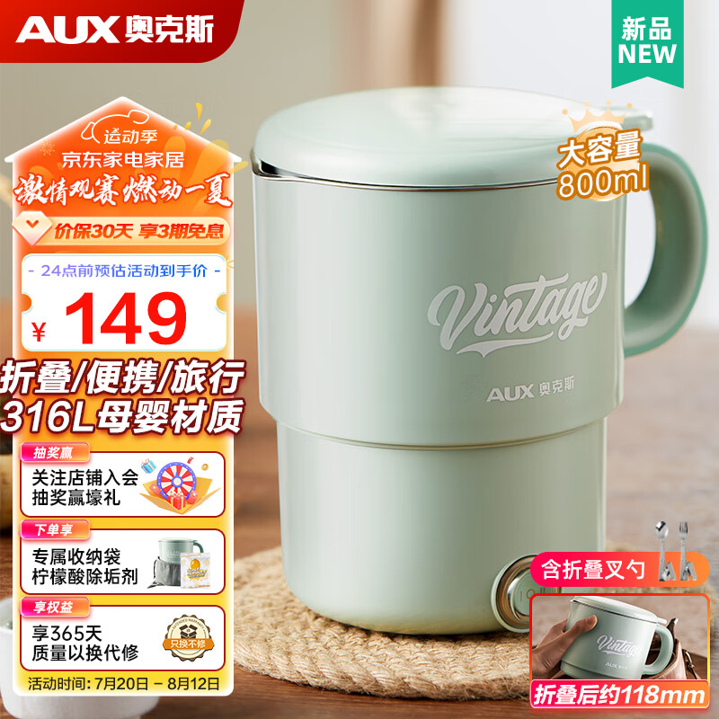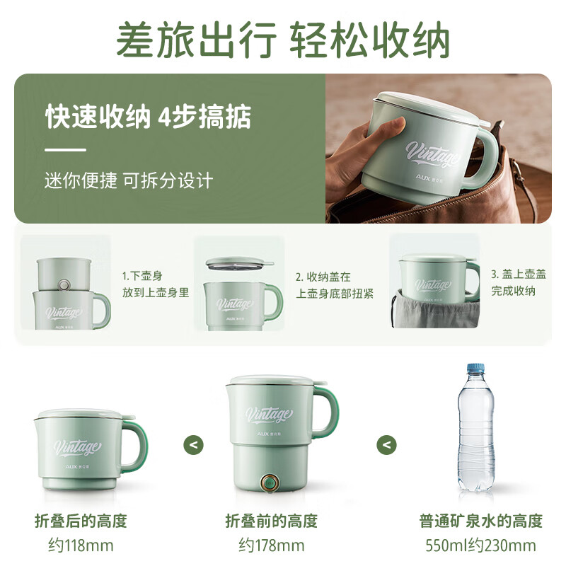 奥克斯(AUX)便携式烧水壶 316L不锈钢折叠水壶烧水旅行电水壶 家用烧水杯养生冲奶保温 HX-A0803E 折叠叉勺款 0.8L价格:179.00元!