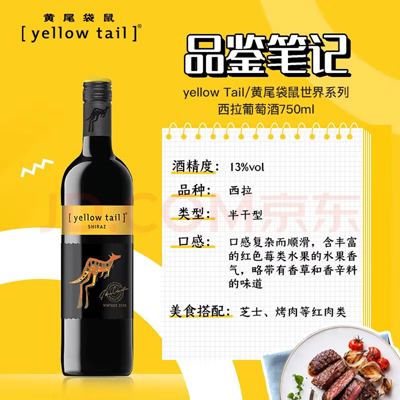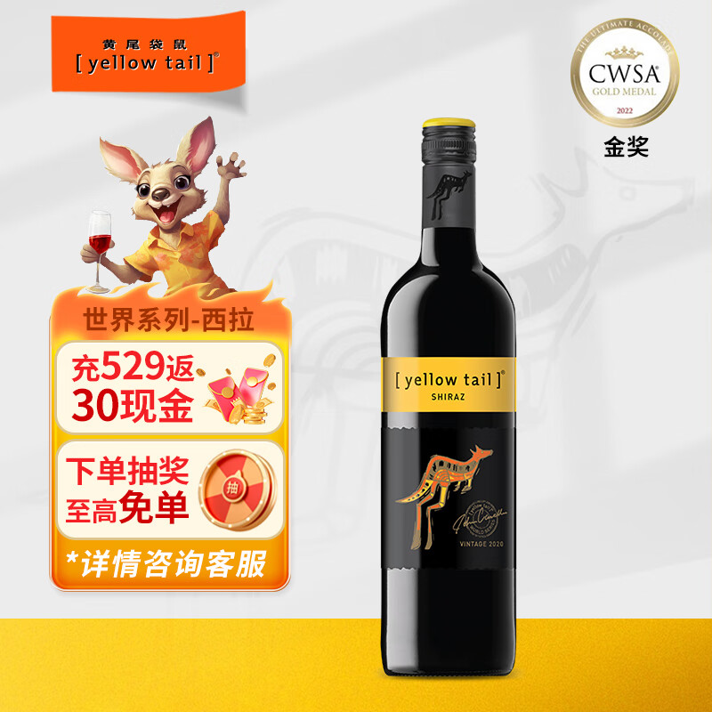 黄尾袋鼠(Yellow Tail)系列红酒 西拉红葡萄酒 750ml 单瓶装价格:65.00元!