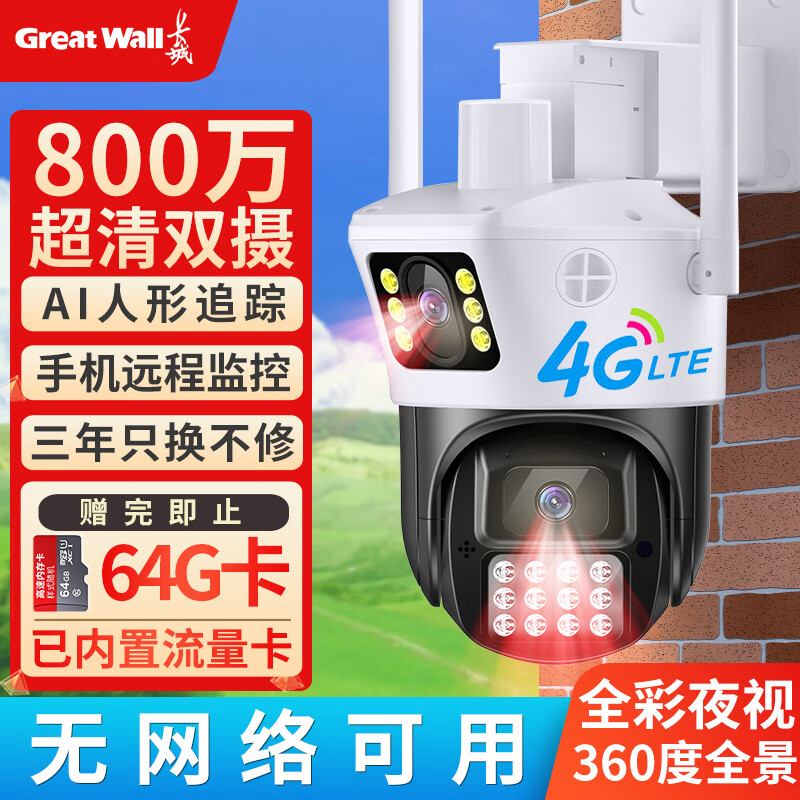 长城4G无线摄像头户外农村手机远程室外无需连wifi监控器家用360度无死角带全彩夜视追踪全景对话价格:149.00元!