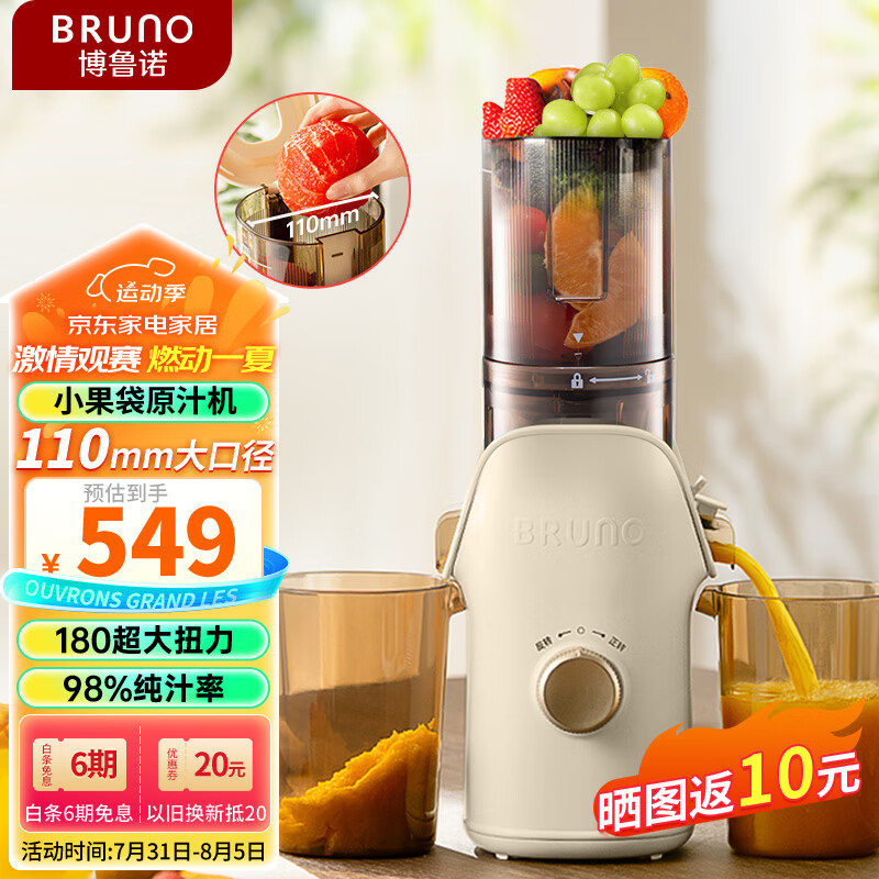BRUNO原汁机多功能大口径家用全自动低速电动冷压榨果蔬榨汁机破壁豆浆养生果汁机渣汁分离象牙白价格:549.00元!