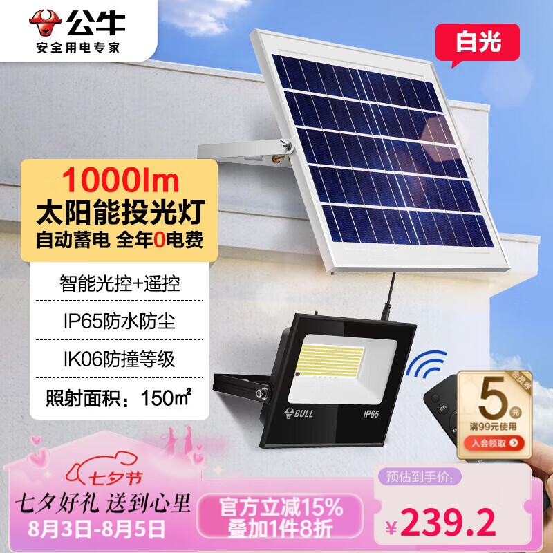 公牛(BULL)太阳能灯户外庭院灯钢化玻璃智能光控远程遥控MG-C150A-AE 3米线价格:369.00元!