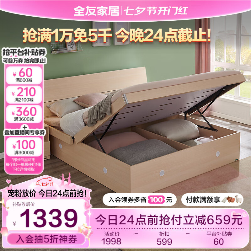 全友家居 现代简约双人床主卧室床家具1.8x2米高箱储物板式床106302价格:1998.57元!