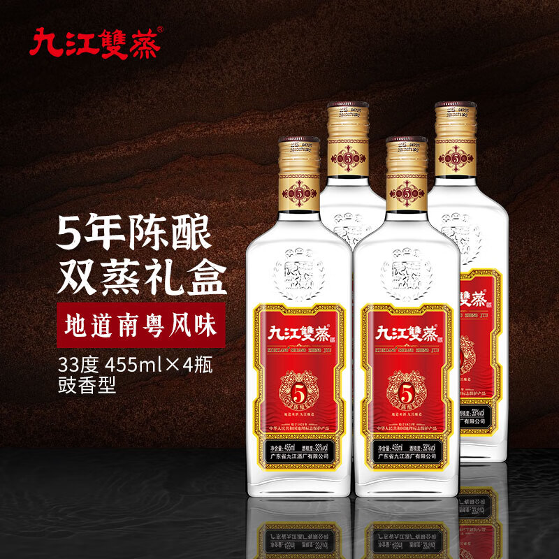 九江双蒸 豉香型白酒 33度双蒸五年陈系列455mlx4瓶 中秋送礼红色经典礼盒价格:140.00元!