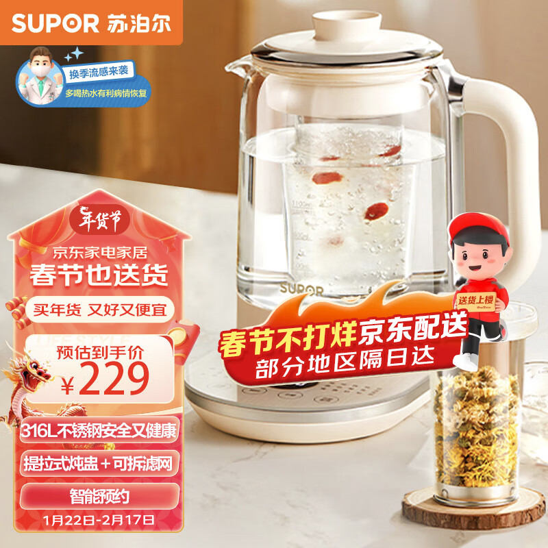 苏泊尔(SUPOR)养生壶 1.5L煮茶器花茶壶 玻璃滤网电茶壶 烧水壶电热水壶 保温煮茶壶 燕窝炖盅壶 SW-15YT10价格:229.00元!