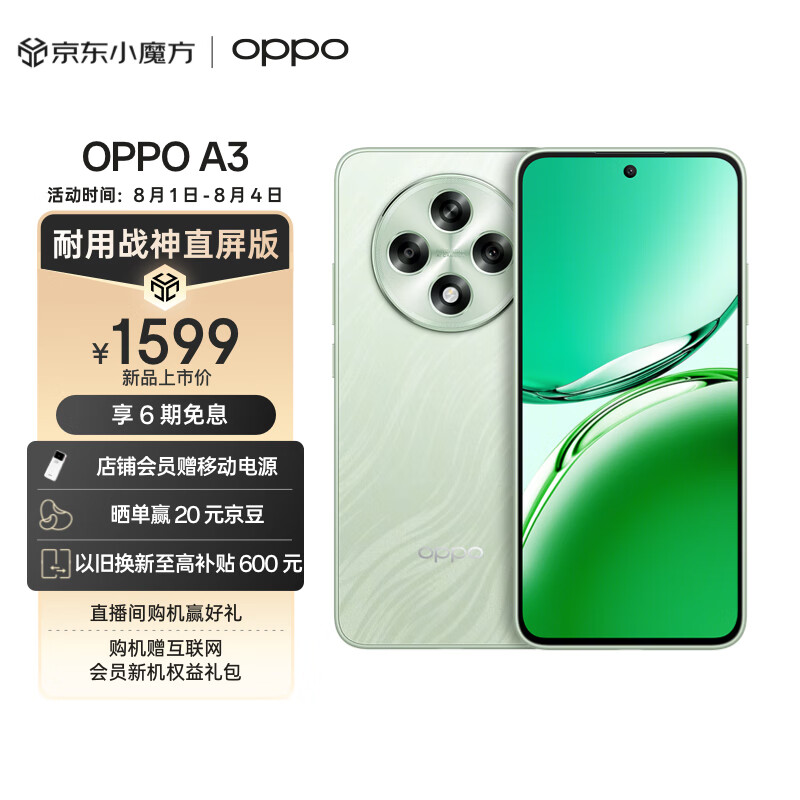 OPPO A3 8GB+256GB 山涧绿 耐用战神直屏版 双面抗摔耐磨 满级生活防水 OLED阳光屏 5G 骁龙 AI手机价格:1599.00元!
