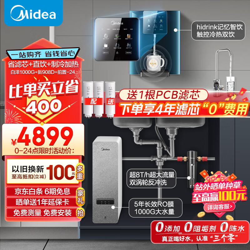 美的(Midea)省芯直饮冷热净水器套装【白泽1000+管线机908D+前置-24pro】hidrink智能 壁挂式加热一体净饮机价格:4899.00元!