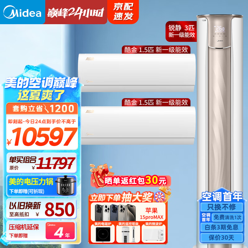 美的(Midea)空调套装 新一级能效 两室一厅 全直流变频冷暖 智能自洁一键防直吹 挂机酷金1.5匹*2+柜机锐静3匹价格:10597.00元!