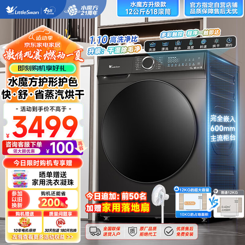 小天鹅滚筒洗衣机全自动 洗烘一体洗衣机带烘干 水魔方12公斤大容量 1.1高洗净比 除菌螨 超薄TD120V618T价格:3499.00元!