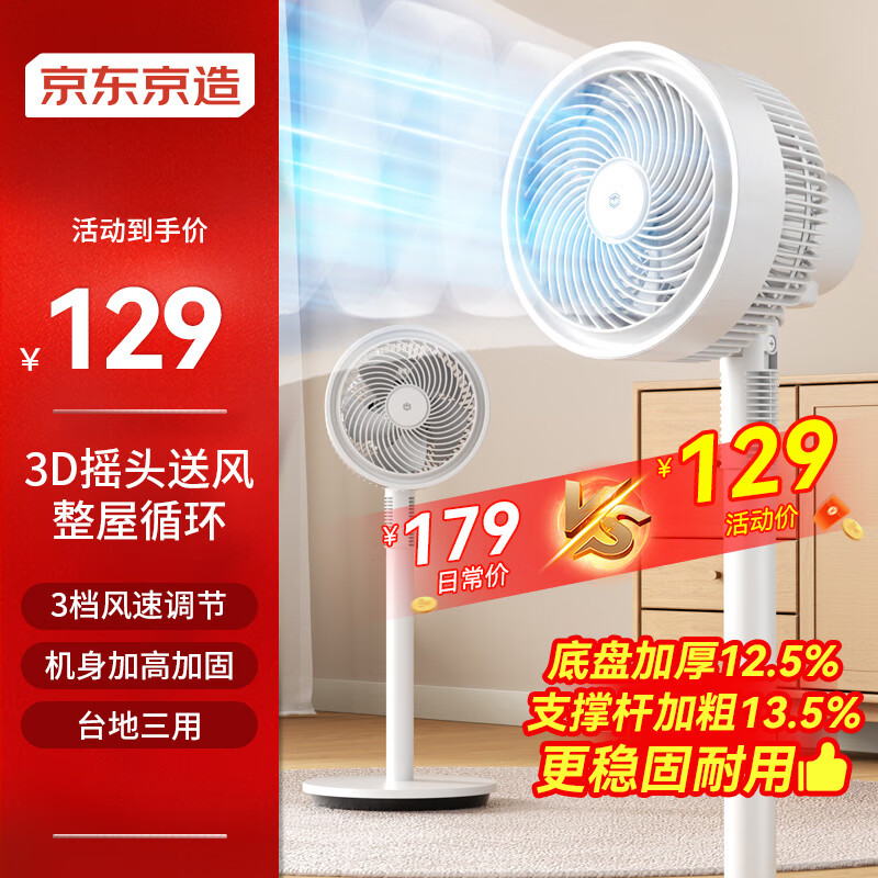 京东京造 3D摇头空气循环扇 家用落地电风扇 轻音大风力 广角送风 高度可调 节能省电 ?呼呼?价格:139.00元!