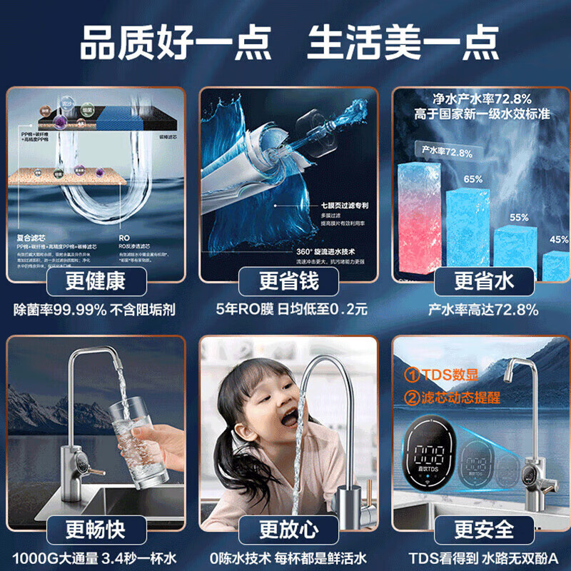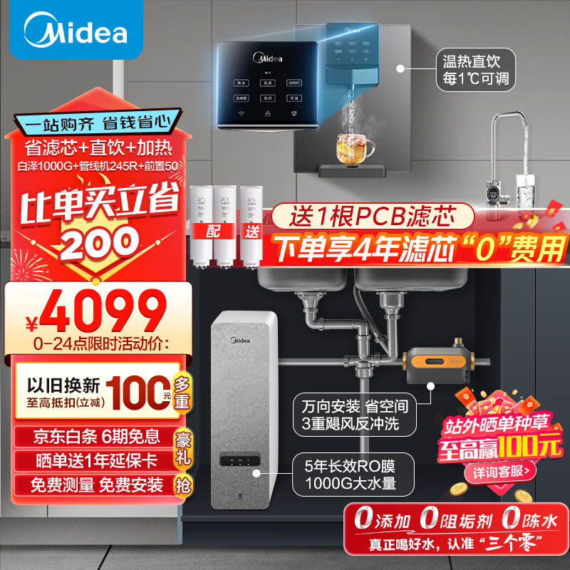 美的(Midea)省芯直饮加热净水器套装【白泽1000+管线机MG245-R+前置-50】反渗透过滤 家用壁挂式一体净饮机价格:4099.00元!