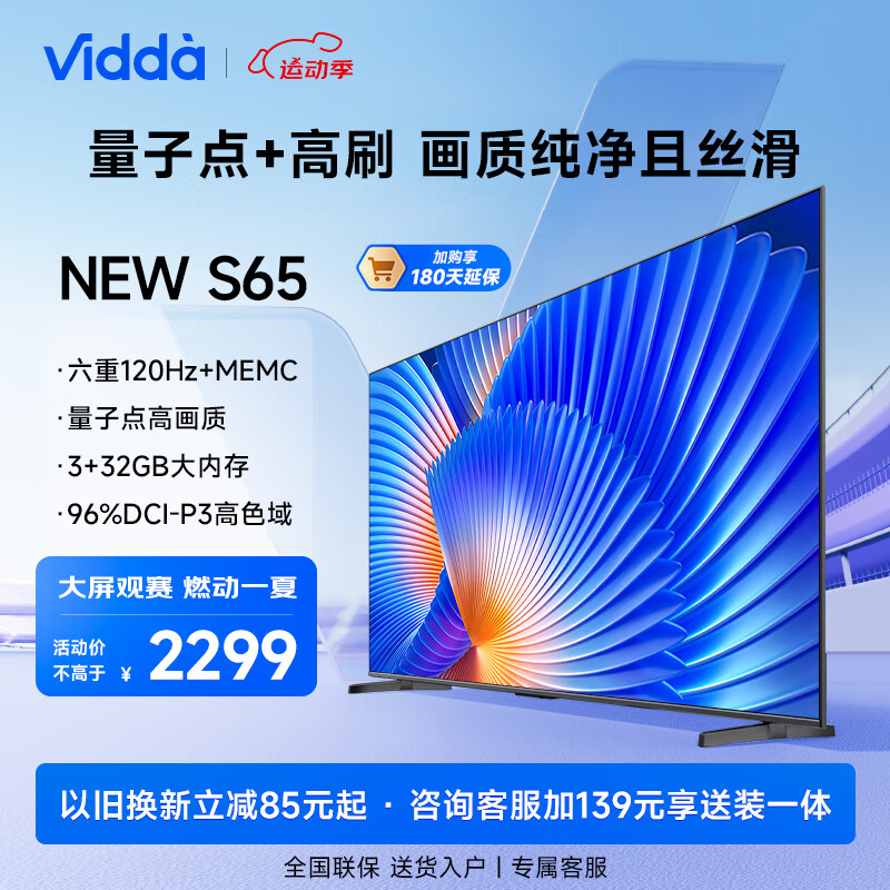 Vidda NEW S65 海信电视 65英寸 120Hz高刷 3+32G HDMI2.1 4K智能超薄游戏液晶巨幕大屏以旧换新65V1N-S价格:2299.00元!