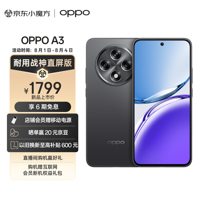 OPPO A3 12GB+256GB 静海黑 耐用战神直屏版 双面抗摔耐磨 满级生活防水 OLED阳光屏 5G 骁龙 AI手机价格:1799.00元!