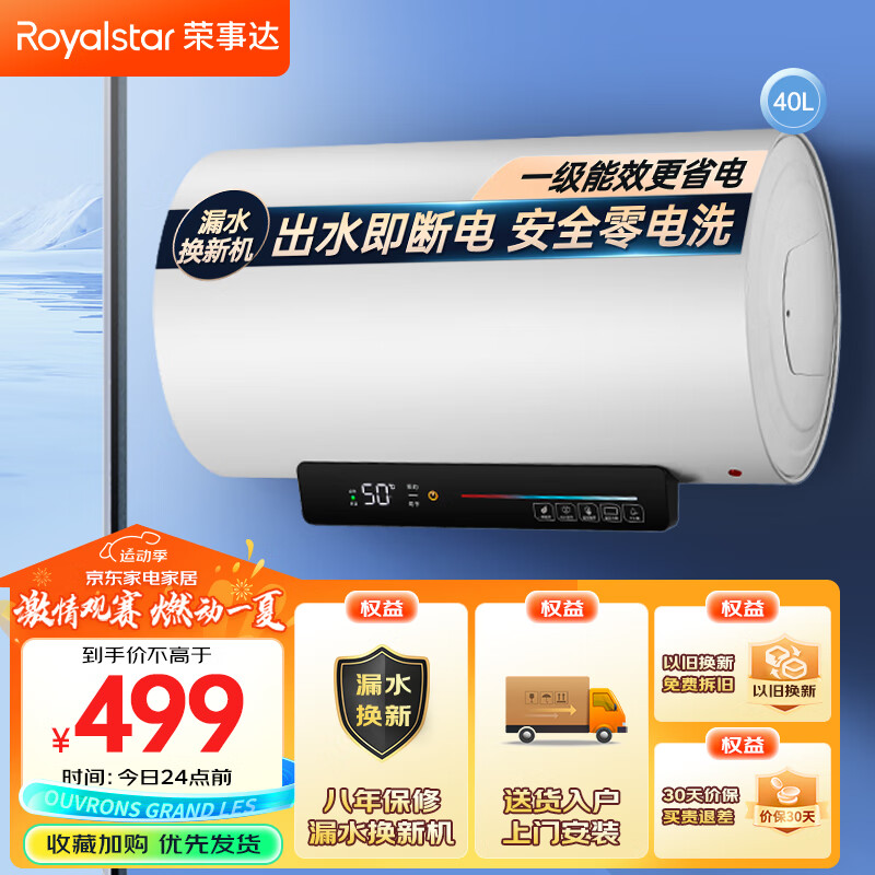 荣事达(Royalstar)40升电热水器家用储水式热水器2200W速热大水量一级能效节能省电 智能出水断电RSD-TD22-40价格:539.00元!