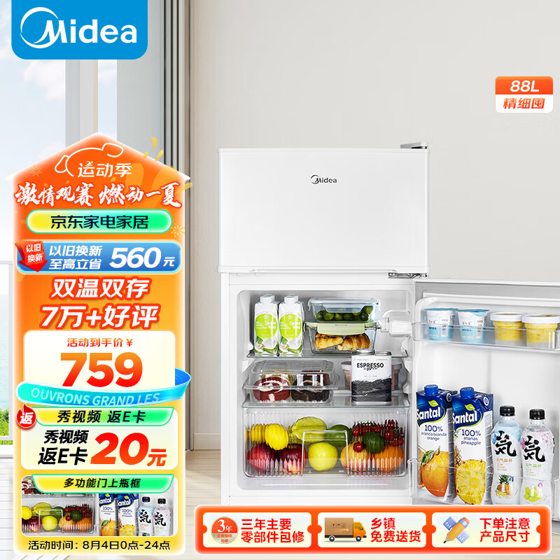 美的(Midea)88升迷你双开门小冰箱租房宿舍办公室小型家用双温可冷冻冷藏节能环保省电低耗低音BCD-88CM价格:698.00元!