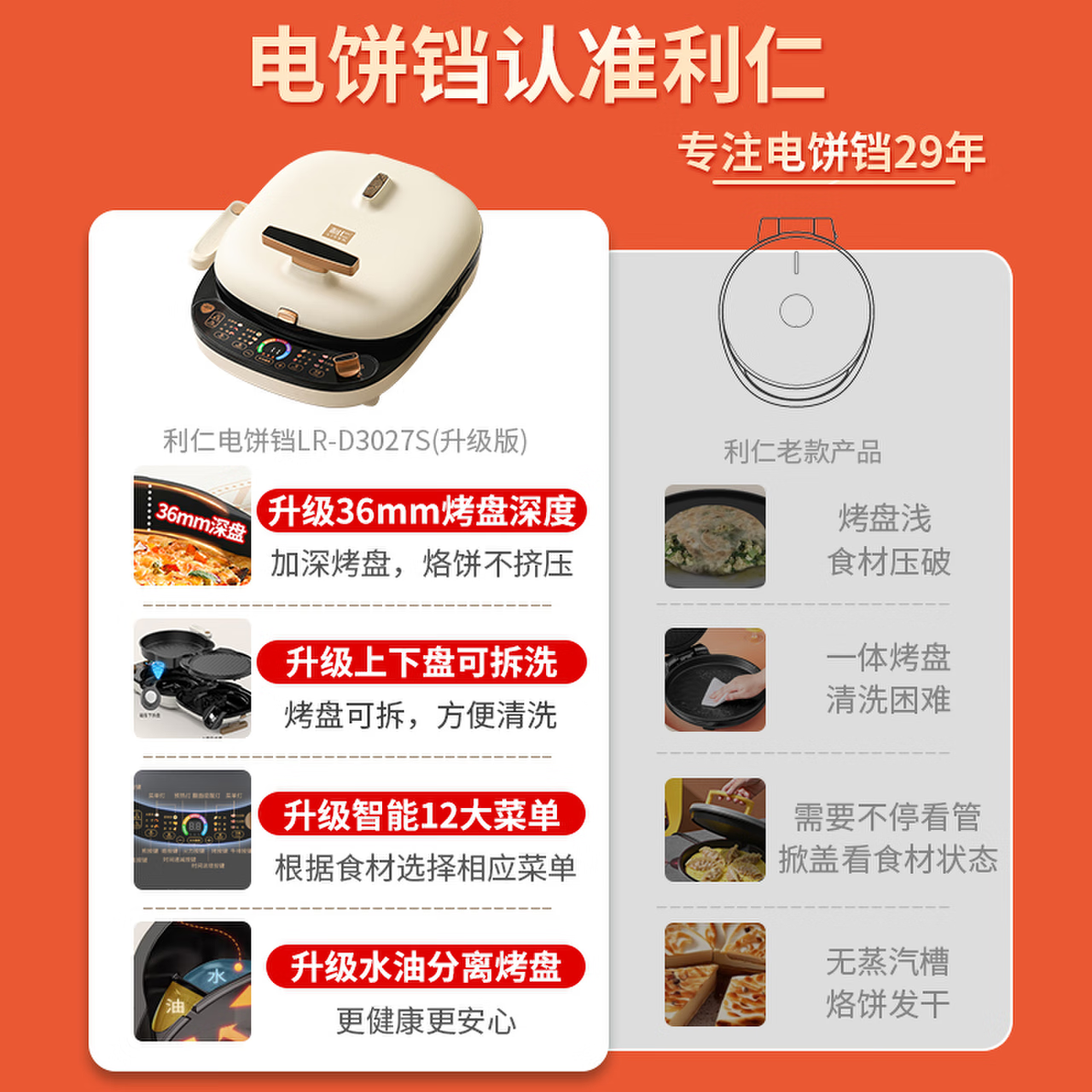 利仁(Liven)电饼铛家用36MM加深盘上下盘可拆洗电饼档双面加热烙饼锅煎饼锅烤肉锅早餐机 LR-D3027S(升级版)价格:319.00元!