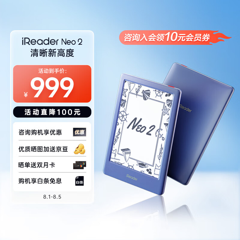 掌阅iReader Neo2 6英寸 电子书阅读器 墨水屏电纸书 平板学习笔记本 轻量便携 32GB 海岛蓝价格:999.00元!