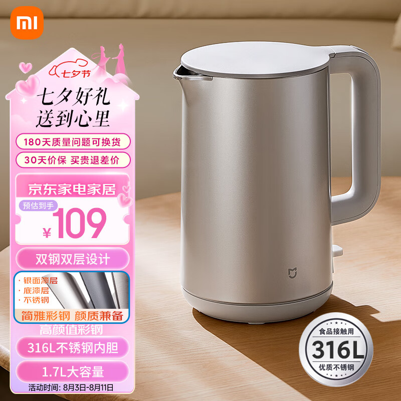 米家小米烧水壶电热水壶煮水壶热水壶家用S1 双钢双层设计316食品级不锈钢内胆大功率1.7L价格:109.00元!