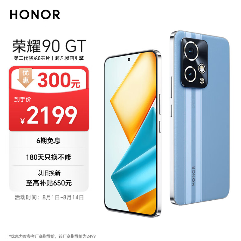 荣耀90 GT 第二代骁龙8旗舰芯 超凡帧画引擎 荣耀绿洲护眼屏 5000mAh轻薄长续航 OIS 12+256 GT蓝 5G直屏价格:2199.00元!