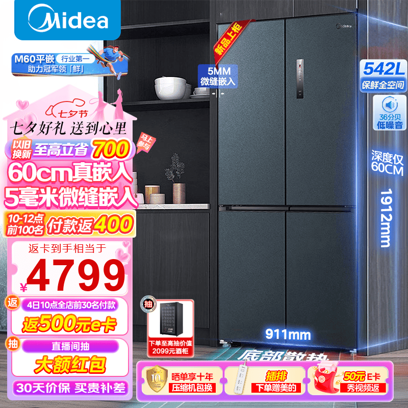 美的M60系列569十字双开四门一级能效双变频60cm纯平全嵌风冷无霜双净味底部散热家用智能大容量电 MR-569WUSPZE价格:5699.00元!