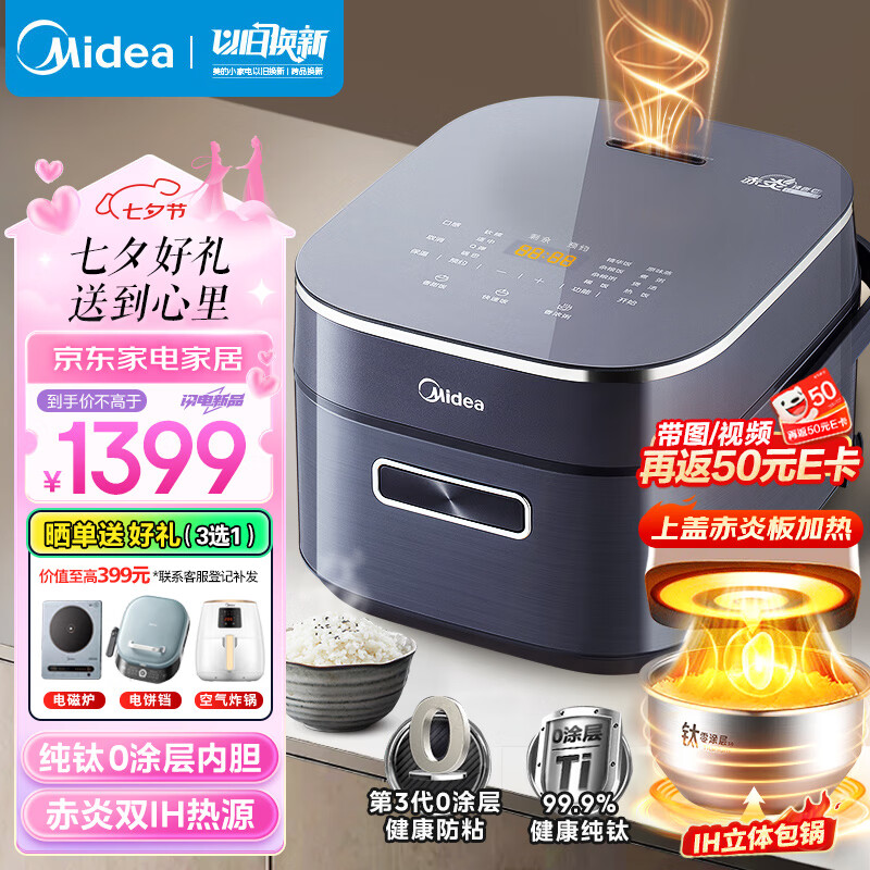 美的赤炎纯钛0涂层电饭煲4L电饭锅家用2-3-4-6-8人米饭锅 上下双IH热源电磁加热【钛釜系列】EFB4028H价格:1599.00元!
