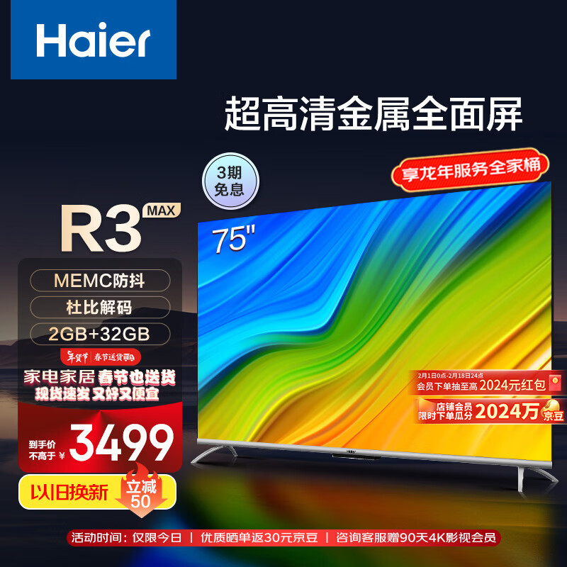 海尔(Haier)75R3-MAX 75英寸超薄金属屏电视 MEMC防抖 远场语音 4K超高清 2+32G大内存智能液晶电视价格:3499.00元!