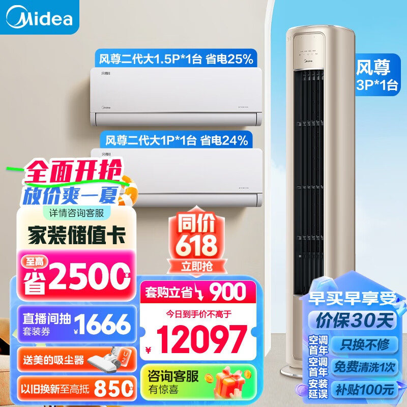 美的(Midea)空调 风尊系列 温馨二居套餐 两室一厅套装(大1.5匹风尊二代+大1匹风尊二代+3匹风尊柜机)价格:12997.00元!