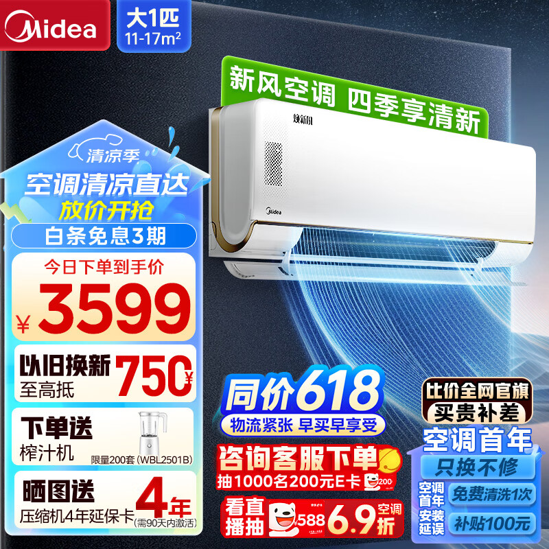 美的(Midea)新风空调 大1匹 焕新风 新一级能效 变频冷暖除湿 壁挂式空调挂机 KFR-26GW/N8MKA1A价格:3599.00元!